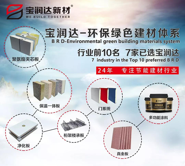 寶潤達自成立以來,以綠色、環(huán)保、節(jié)能為核心,專注于綠色節(jié)能環(huán)保建材產(chǎn)品的研發(fā),寶潤達自主研發(fā)出聚氨酯節(jié)能板材、外墻保溫裝飾一體板、鋼筋桁架樓承板、無菌凈化板、多功能性環(huán)保涂料等全球最新主流綠色環(huán)保節(jié)能建筑裝飾用品、系統(tǒng)集成品,助推環(huán)保節(jié)能事業(yè)的建設(shè)發(fā)展。