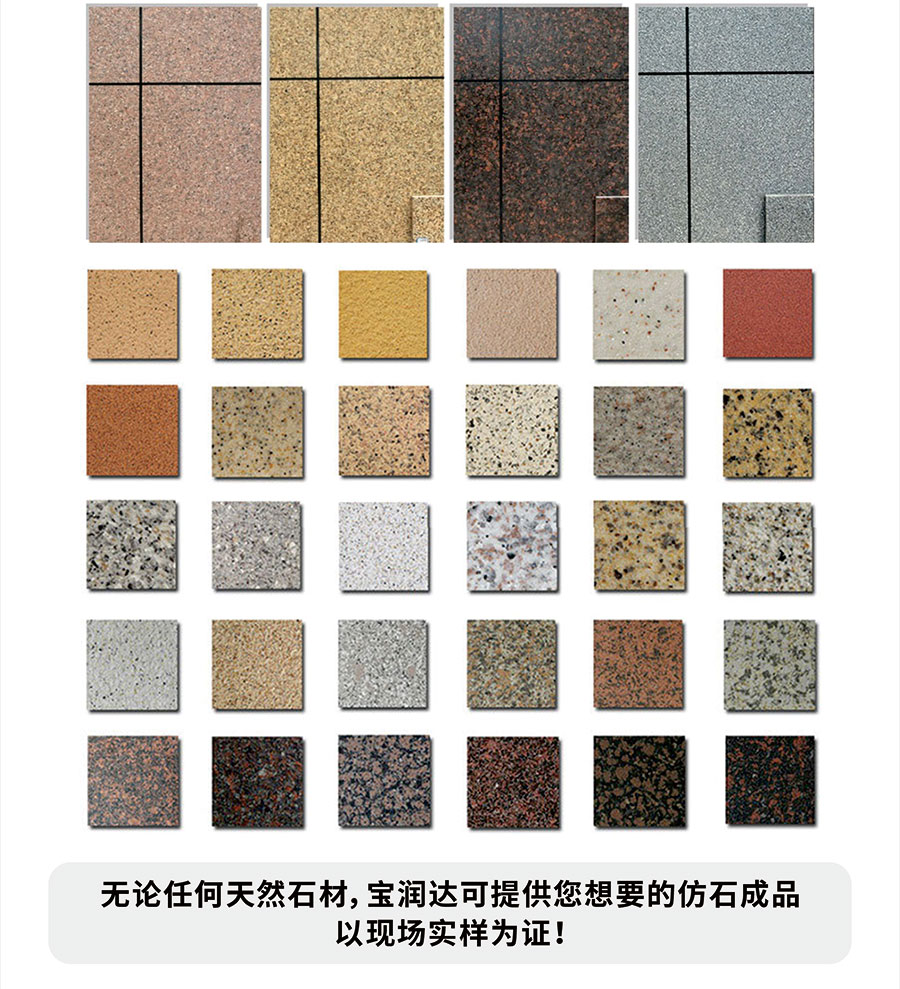 寶潤達一體板飾面層采用真石漆,多彩漆,水包水,水包砂,乳膠漆,實色/金屬氟碳超3000種顏色定制,可根據(jù)石材定做樣品