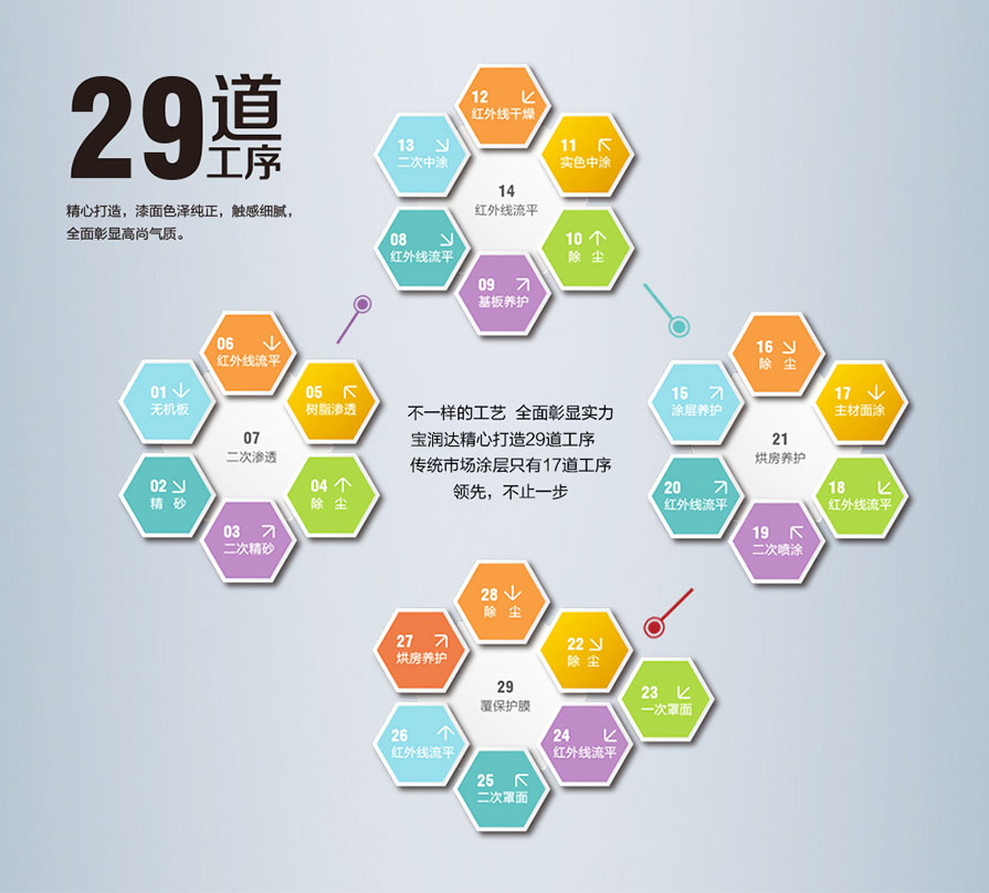 色彩統(tǒng)一 寶潤達擁有系統(tǒng)化的色彩控制方案 完美的原材料供應保障 40噸單缸產(chǎn)能 專業(yè)化的產(chǎn)品涂裝技術 |